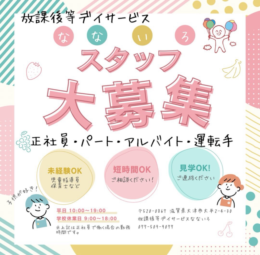 | 職種 | <放課後等デイサービスなないろ>保育士・児童指導員 |